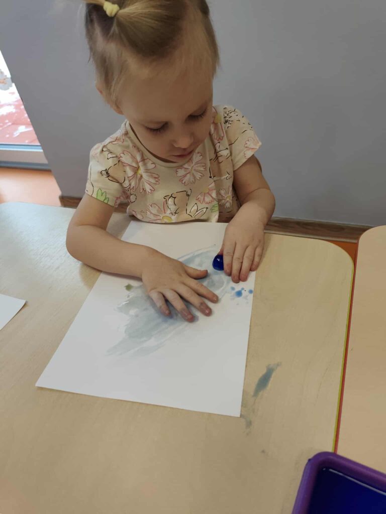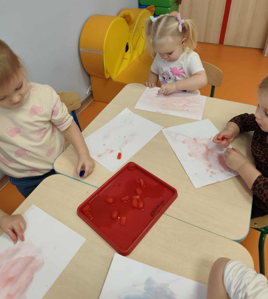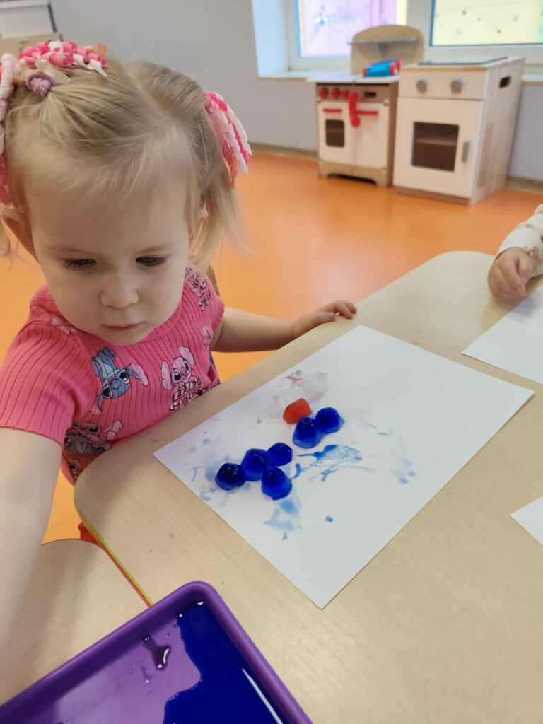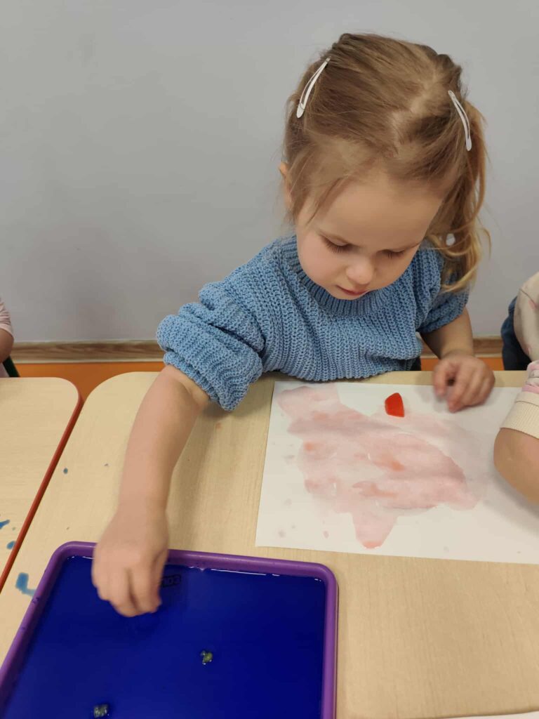 Malowanie kostkami lodu pozwoliło dzieciom na poznawanie kolorów i ich mieszanie, obserwowanie zmian stanu skupienia oraz rozwijanie koordynacji ręka-oko.