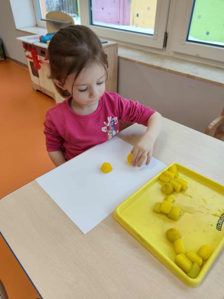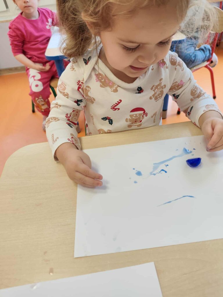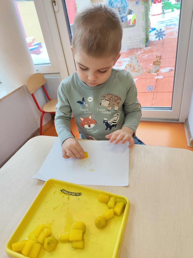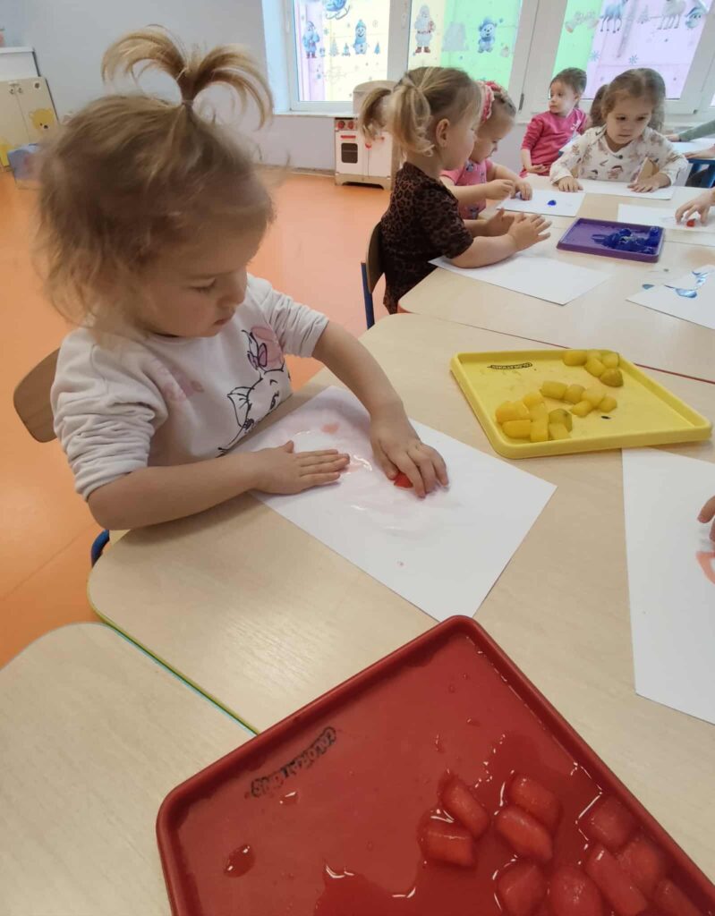 Malowanie kostkami lodu pozwoliło dzieciom na poznawanie kolorów i ich mieszanie, obserwowanie zmian stanu skupienia oraz rozwijanie koordynacji ręka-oko.