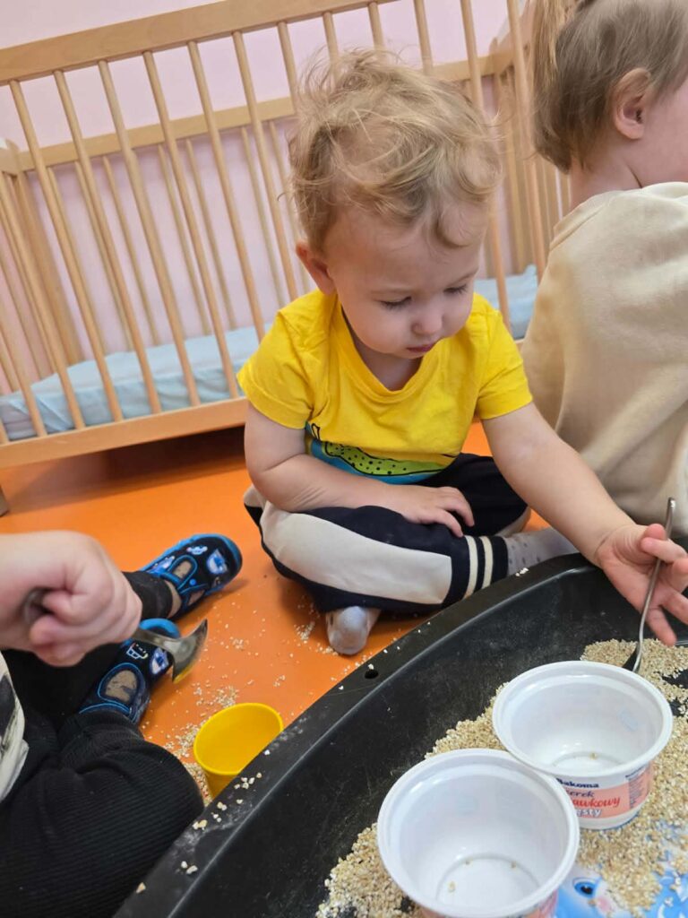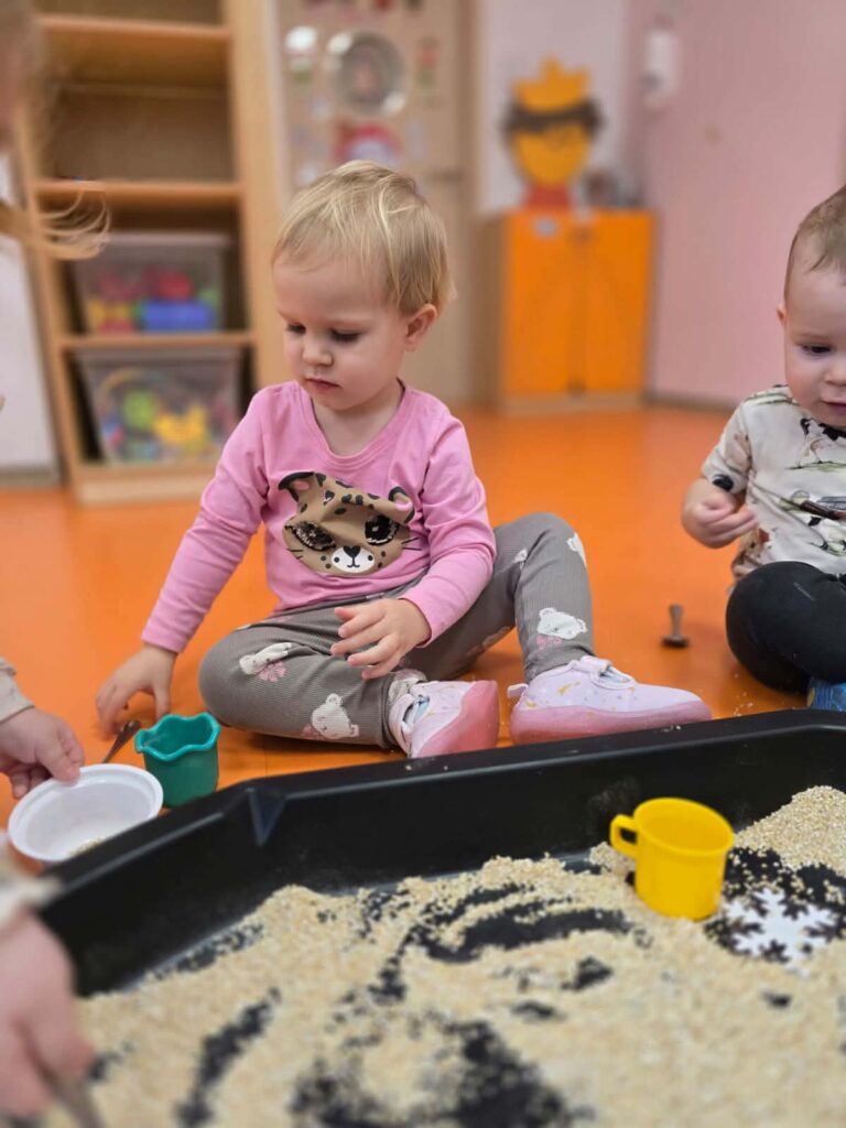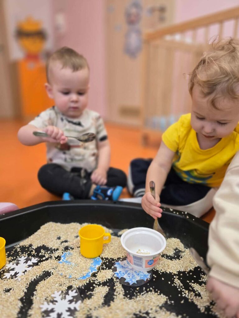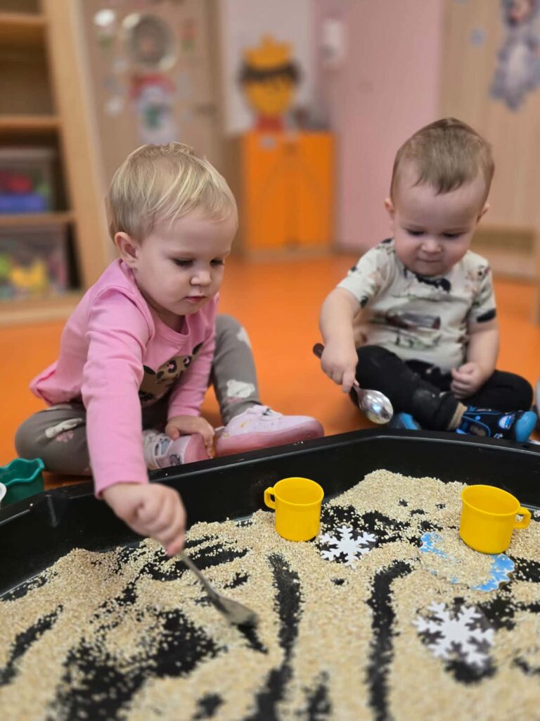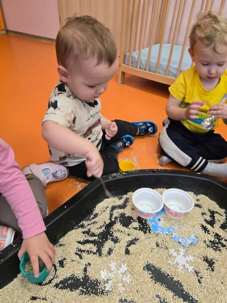 Na dzisiejszych zajęciach Elfiki wykonywały śnieżynkę z kaszy jęczmiennej. Celem tej zabawy było stymulowanie zmysłów dziecka, w szczególności zmysłu dotyku i wzroku.