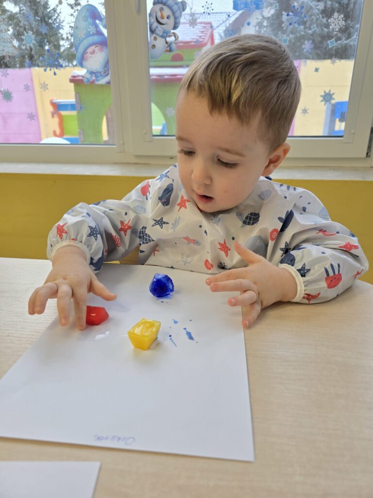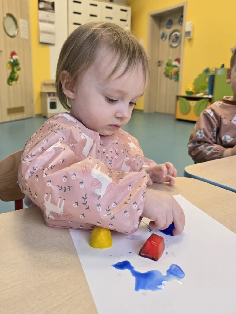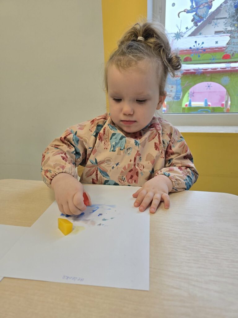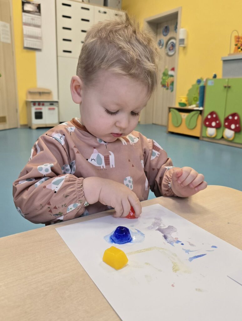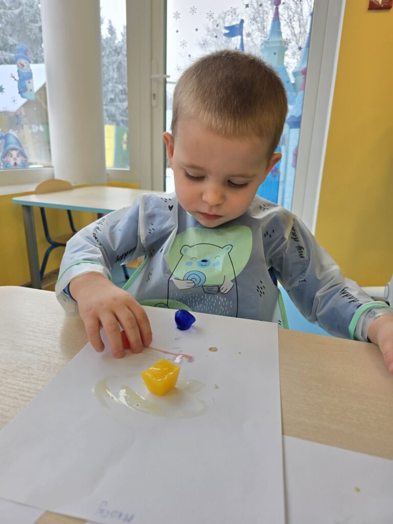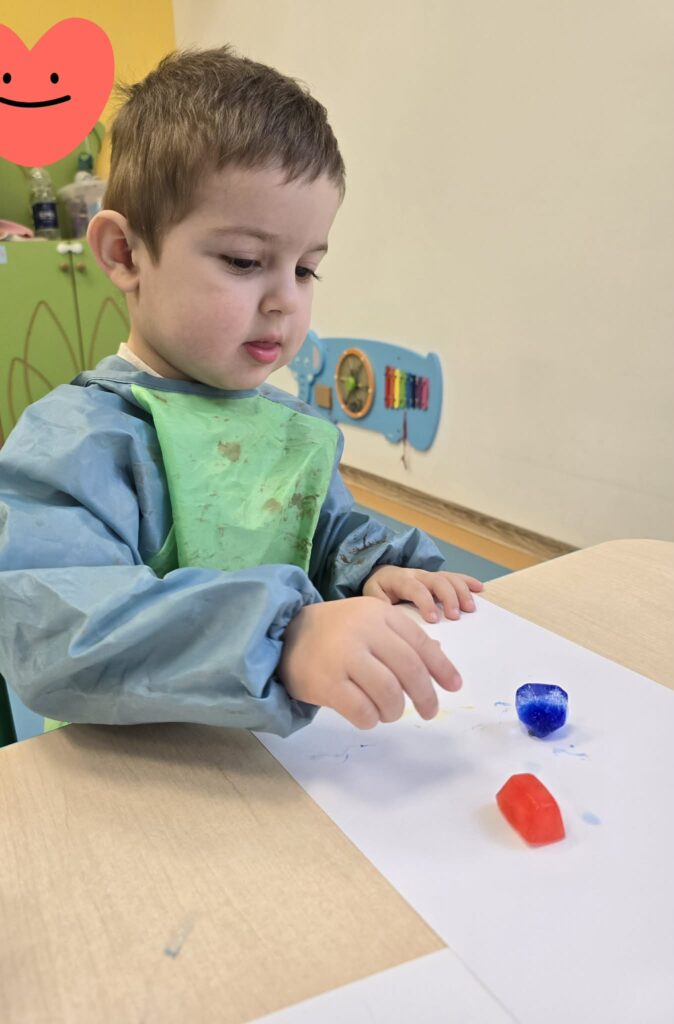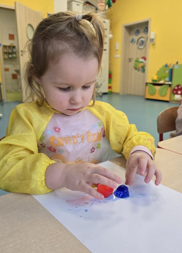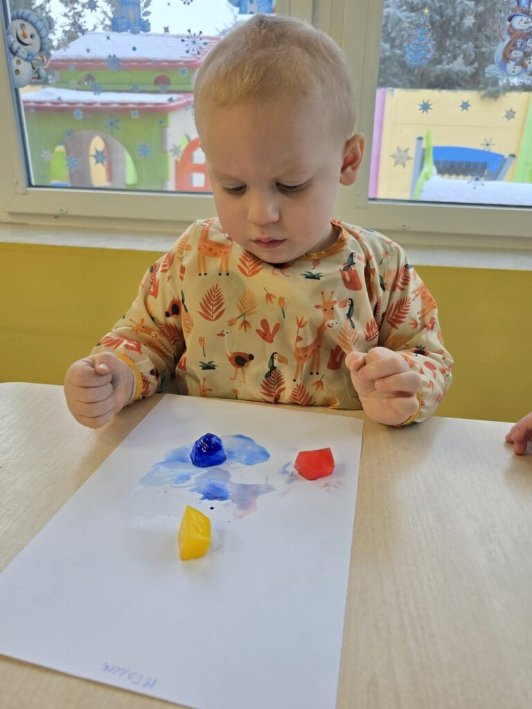 Zajęcia plastyczno-sensoryczne, które polegały na malowaniu na kartce papieru zabarwionymi kostkami lodu. Dzieci przesuwały kostki lodu po papierze, obserwując powstające ślady oraz mieszanie się kolorów. Dzięki takim zajęciom dzieci rozwijają kreatywność, motorykę małą, doświadczają zmiany zachodzące podczas topnienia lodu.